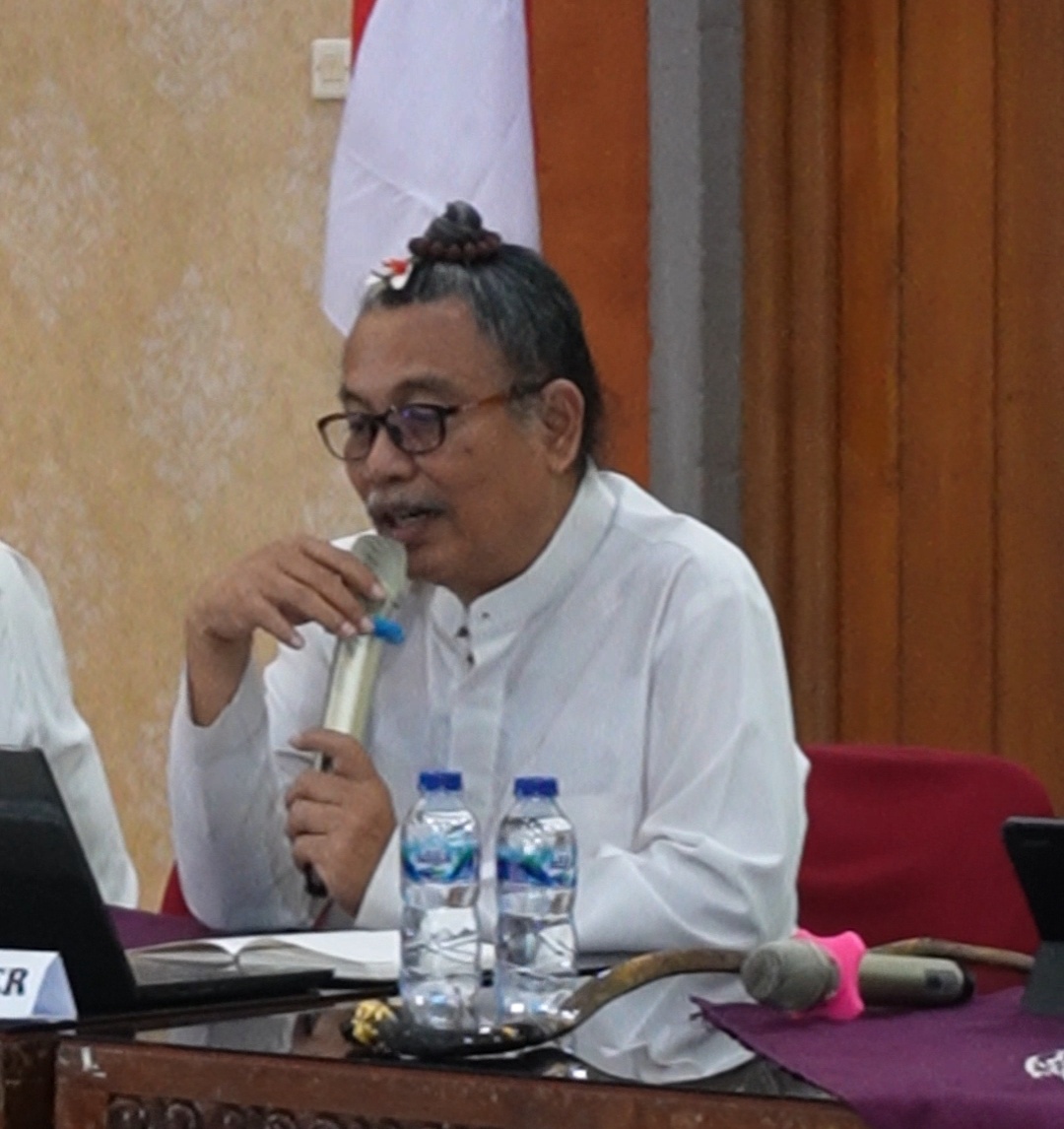 Narasumber yang mengupas tuntas materi tersebut adalah, Ida Pandita Mpu Nabe Jaya Wijayananda, Ida Bhagawan Agra Sagening, Dr. Komang Indra Wirawan, S.Sn, M.Fil dan Prof. Dr. Drs. I Made Surada MA.