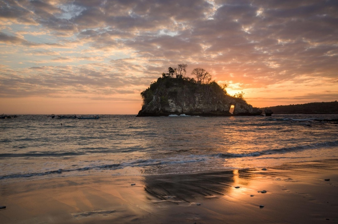 Senja semakin dalam. Matahari tenggelam perlahan di balik bukit kecil di tengah laut, menciptakan siluet yang magis.