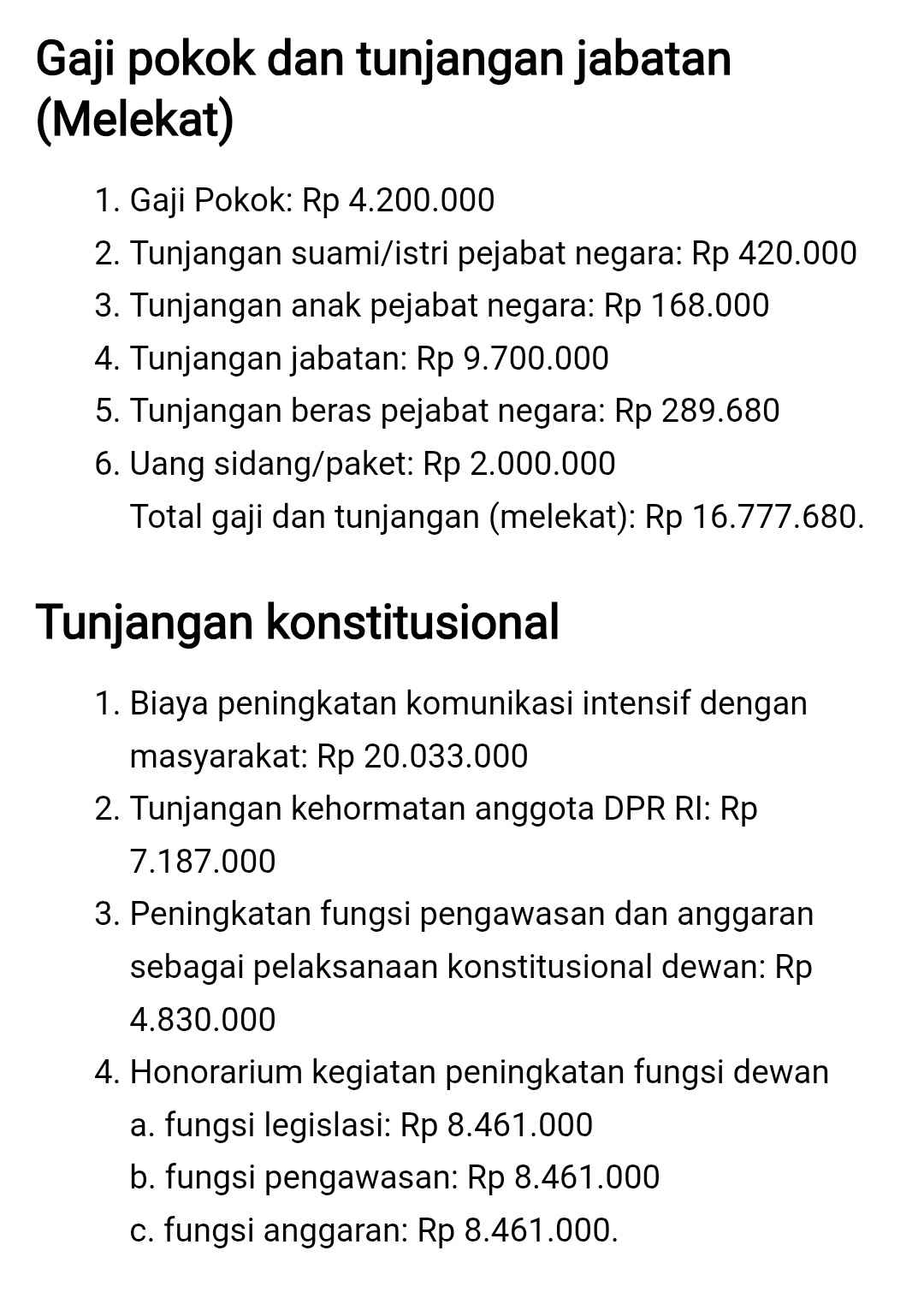 Namun hasil perhitungan dokumen resmi menunjukkan pemangkasan itu tak berdampak signifikan. Setelah pajak, anggota DPR masih membawa pulang gaji bersih Rp65.595.730.
