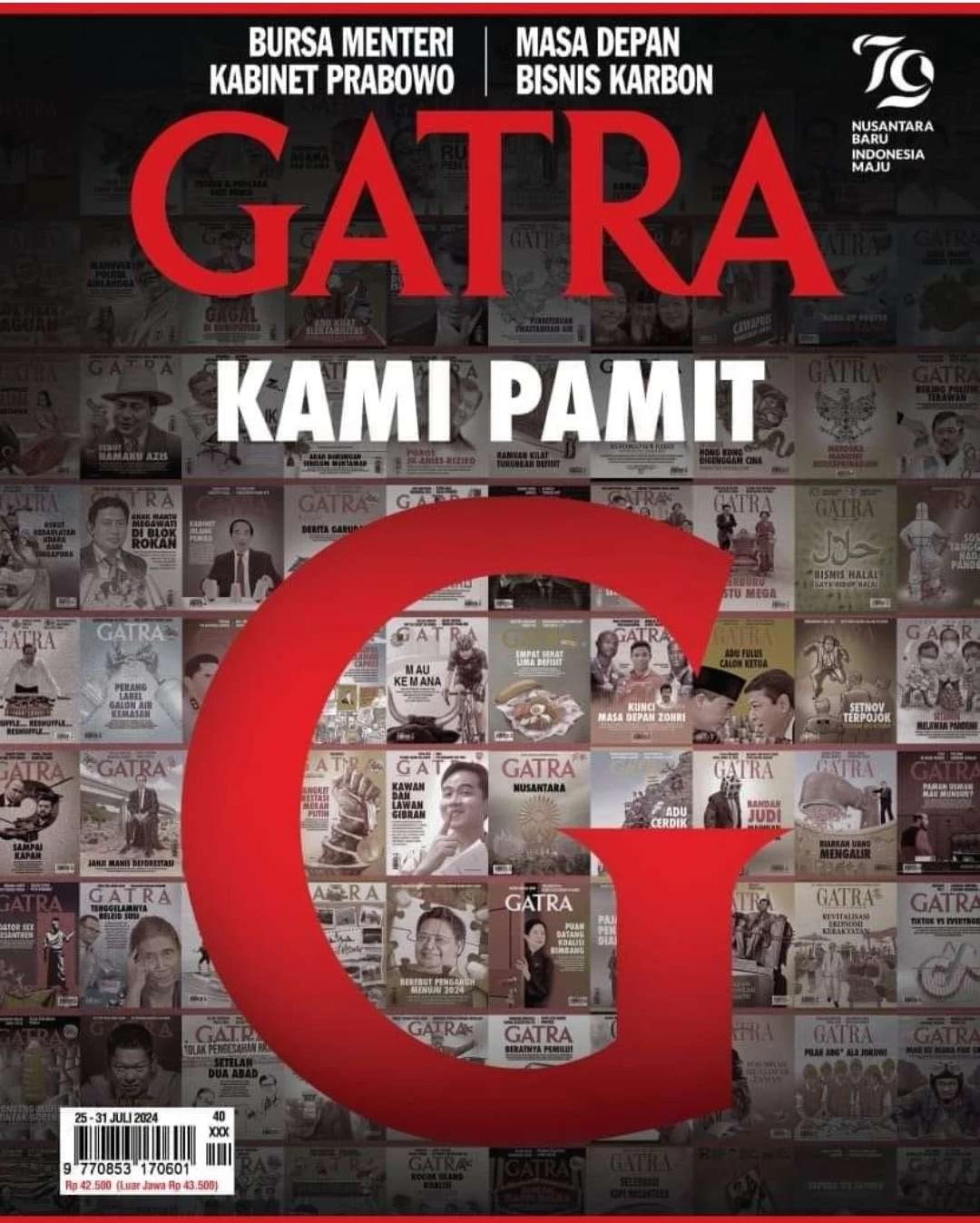 Meski menjadi edisi penutup, Gatra tetap menyajikan laporan utama, di antaranya mengenai bursa calon menteri dalam Kabinet Prabowo serta isu masa depan bisnis karbon. Di sudut kanan atas, tercantum angka 79 sebagai penanda peringatan Hari Kemerdekaan Republik Indonesia dengan tajuk “Nusantara Baru, Indonesia Maju”.