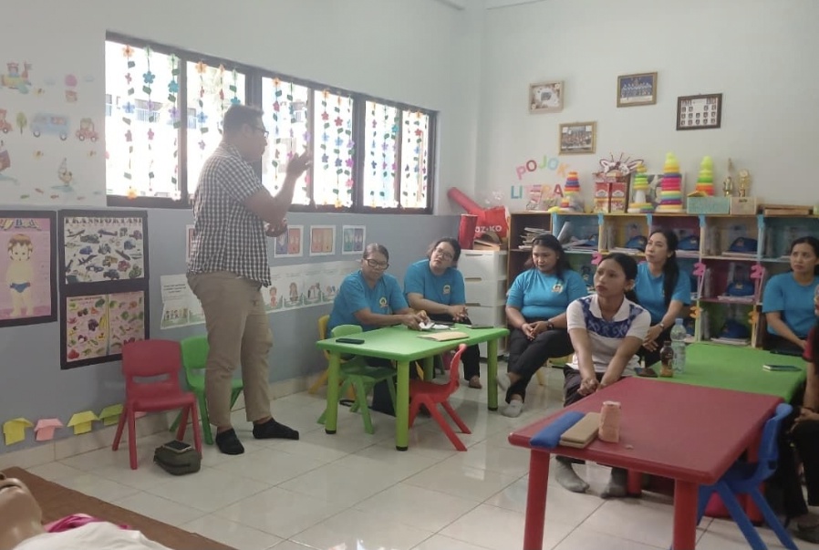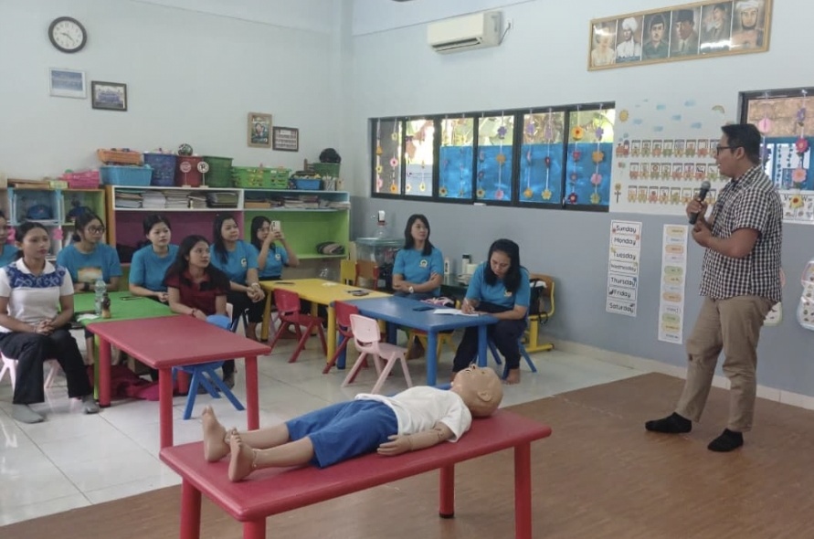 Sebanyak 12 guru dan pegawai Bali Public School mengikuti pelatihan penanganan kasus tersedak atau sumbatan jalan napas, sekaligus edukasi penggunaan kemasan ramah lingkungan.
