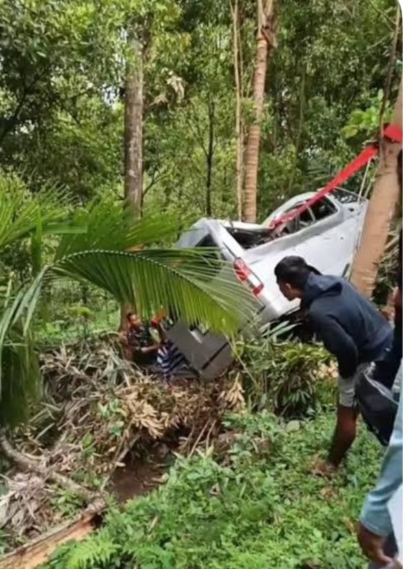 Kendaraan yang dikemudikan Arif Al Akbar diduga hilang kendali saat melintasi jalan menurun dan menikung hingga keluar jalur, masuk ke kebun warga, dan menabrak pohon.