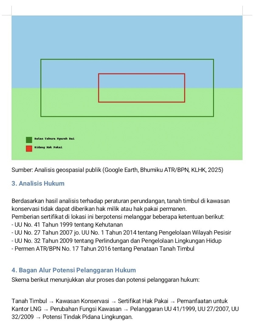 Dalam kajian hukumnya dari sejumlah regulasi nasional, kegiatan ini berpotensi melanggar setidaknya enam peraturan utama, termasuk UU Kehutanan, UU Lingkungan Hidup, dan Perda RTRW Bali Nomor 16 Tahun 2009.
