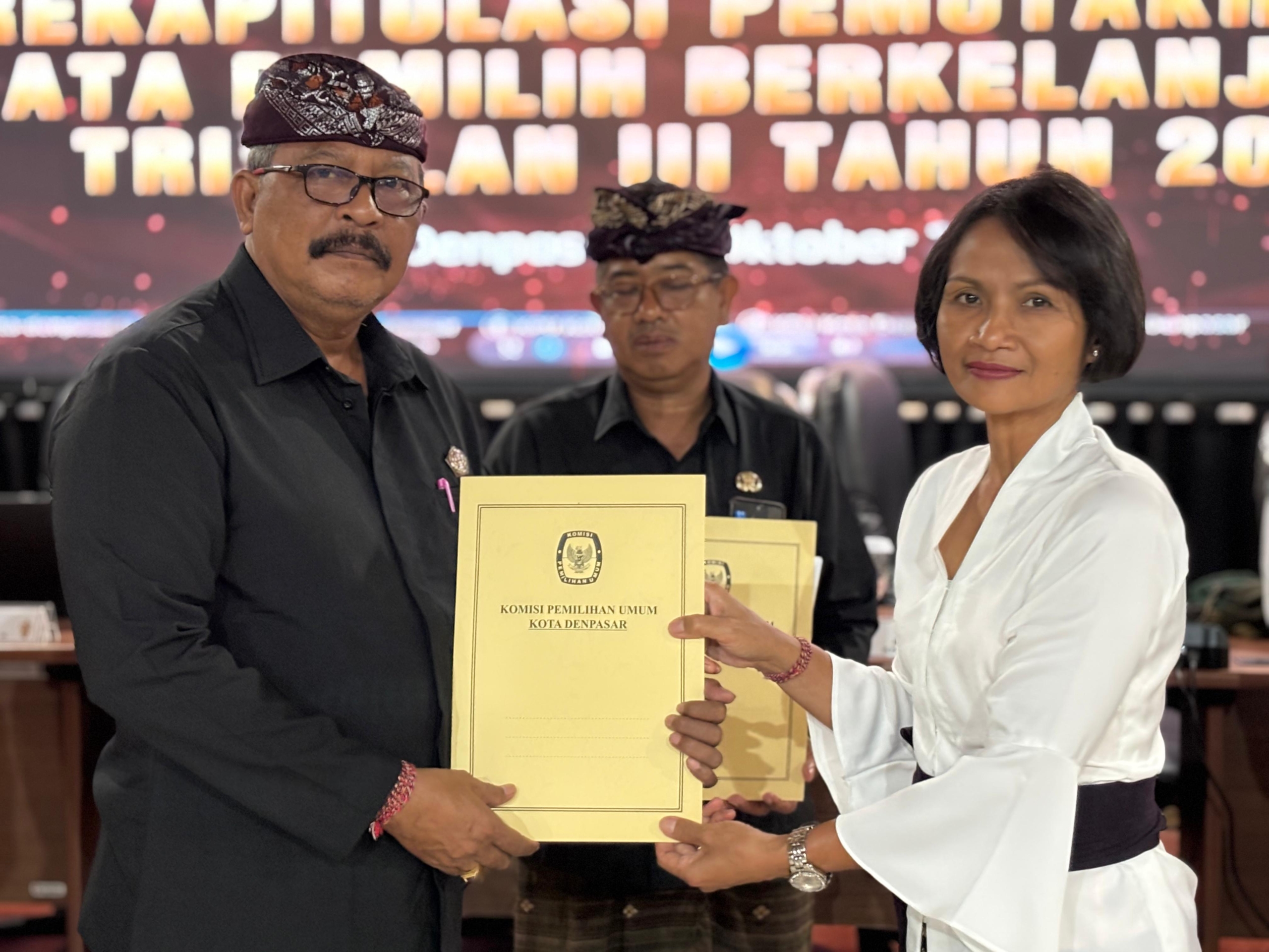 Hasil rapat pleno menetapkan jumlah pemilih berkelanjutan di Kota Denpasar pada Triwulan III Tahun 2025 sebanyak 516.760 orang, terdiri atas 252.751 pemilih laki-laki dan 264.009 pemilih perempuan yang tersebar di empat kecamatan. Penetapan tersebut dituangkan dalam Berita Acara Nomor 127/PL.01.2-BA/5171/2025.