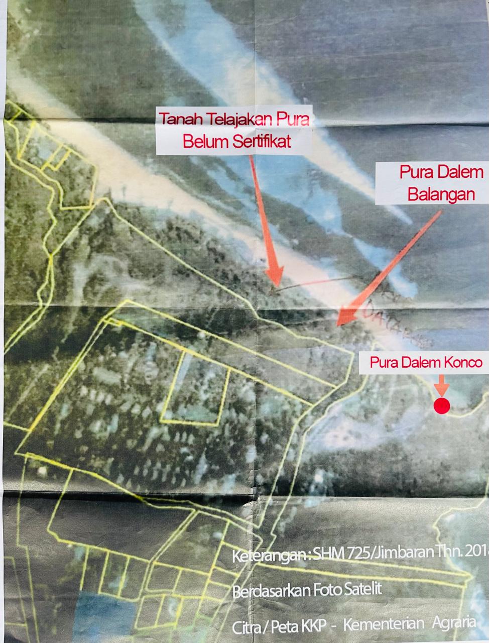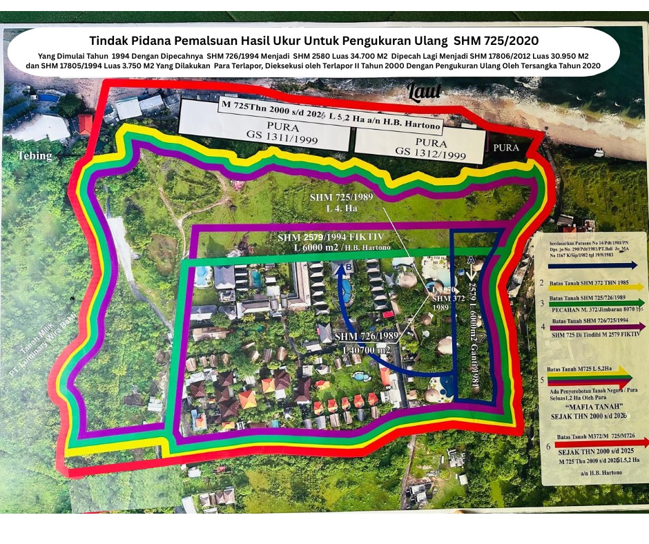 Dalam penjelasannya pada peta, diduga dengan sengaja “menelan” 7.050 m² tanah sakral Nista Mandala Pura Dalam Balangan (di bawah tebing) plus 3.000 m² tanah negara/tebing, lalu digabungkan ke Sertifikat Hak Milik (SHM) 725/Jimbaran milik salah satu pengusaha kaya di Bali. Dengan dugaan Sertifikat 4 hektar menjadi lebih besar menjadi 5,1 hektar di lapangan, tentu hal ini menyebabkan negara dirugikan.