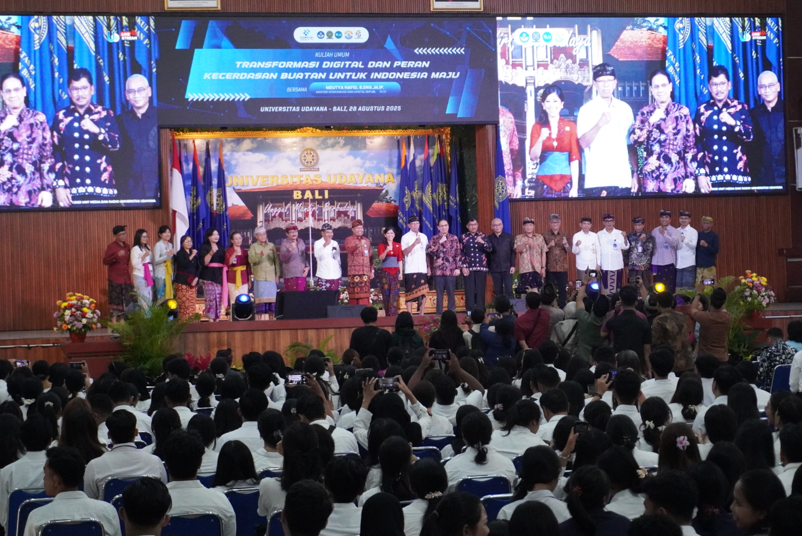 Jimbaran, 28 Agustus 2025 – Menteri Komunikasi dan Digital (Komdigi) Republik Indonesia, Meutya Hafid, B.Eng., M.I.P., hadir memberikan kuliah umum di Auditorium Widya Sabha Universitas Udayana (Unud), Jimbaran. Lebih dari 1.500 mahasiswa baru dari jenjang S1, S2, hingga Program Pendidikan Dokter Spesialis antusias mengikuti kegiatan yang mengusung tema “Transformasi Digital dan Peran Kecerdasan Buatan untuk Indonesia Maju.”