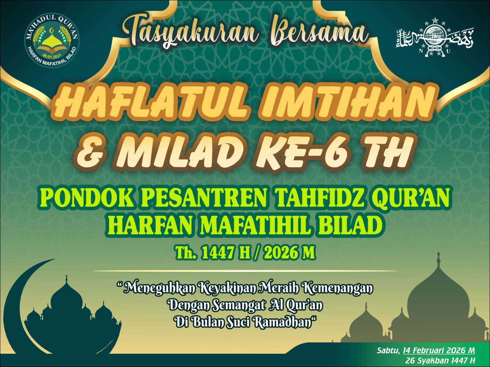 “Teruslah semangat menimba ilmu agama, Al-Qur’an, dan hadis. Terima kasih kepada para pengasuh dan ustaz yang telah sabar dan ikhlas membimbing para santri,” ujarnya.