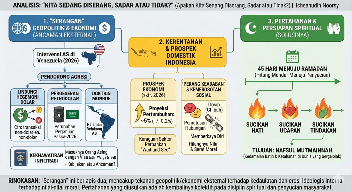 Ia menyebut bangsa ini sedang berada dalam situasi “kejutan sistemik” yang bekerja secara senyap namun terstruktur, melalui tekanan ekonomi global sekaligus kerusakan nilai-nilai moral di dalam negeri. Menurutnya, jika kondisi ini tidak disadari sejak dini, Indonesia berisiko kehilangan kendali atas arah ekonomi dan politiknya sendiri.