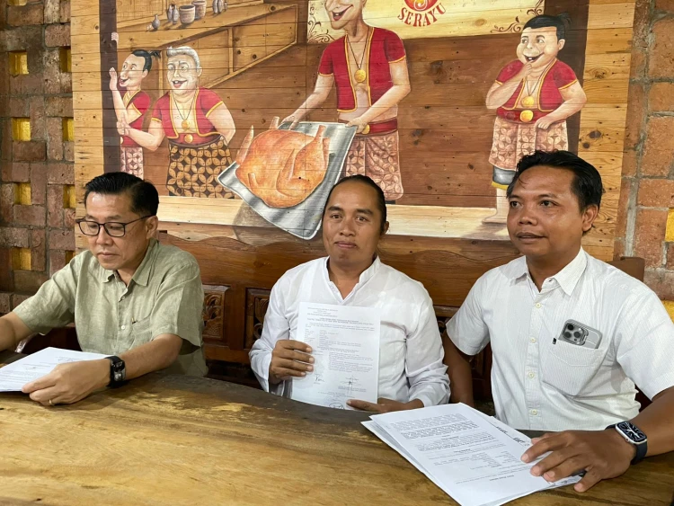 Hartono (kiri) didampingi kuasa hukumnya, Made Somya Putra SH., MH, Nyoman Suarta SH, usai membuat laporan ke Polresta Denpasar, Senin (6/4/26).