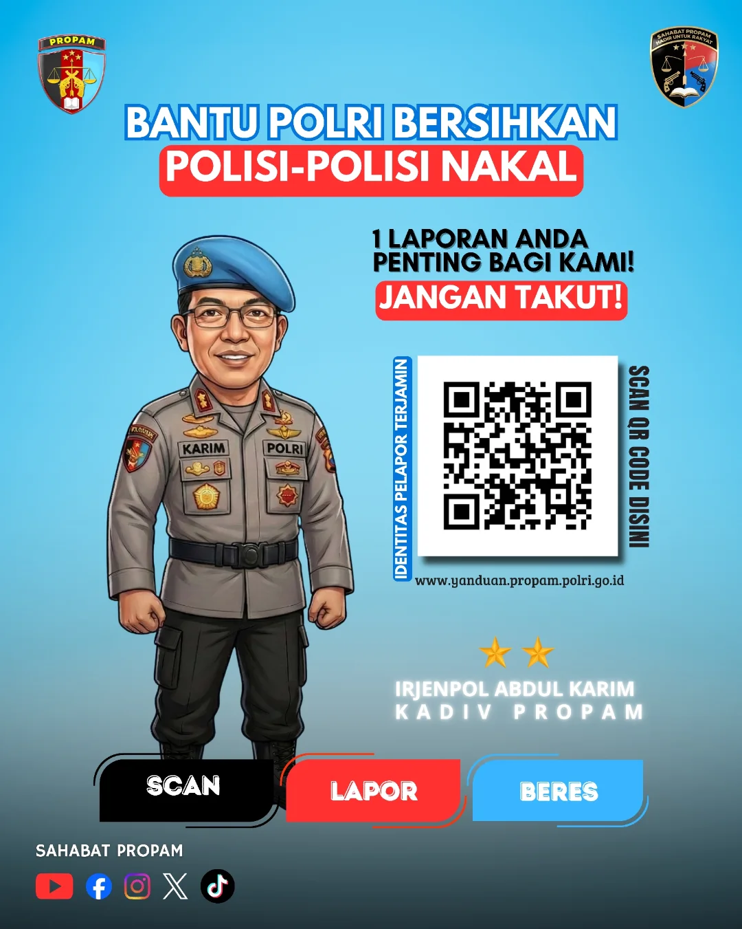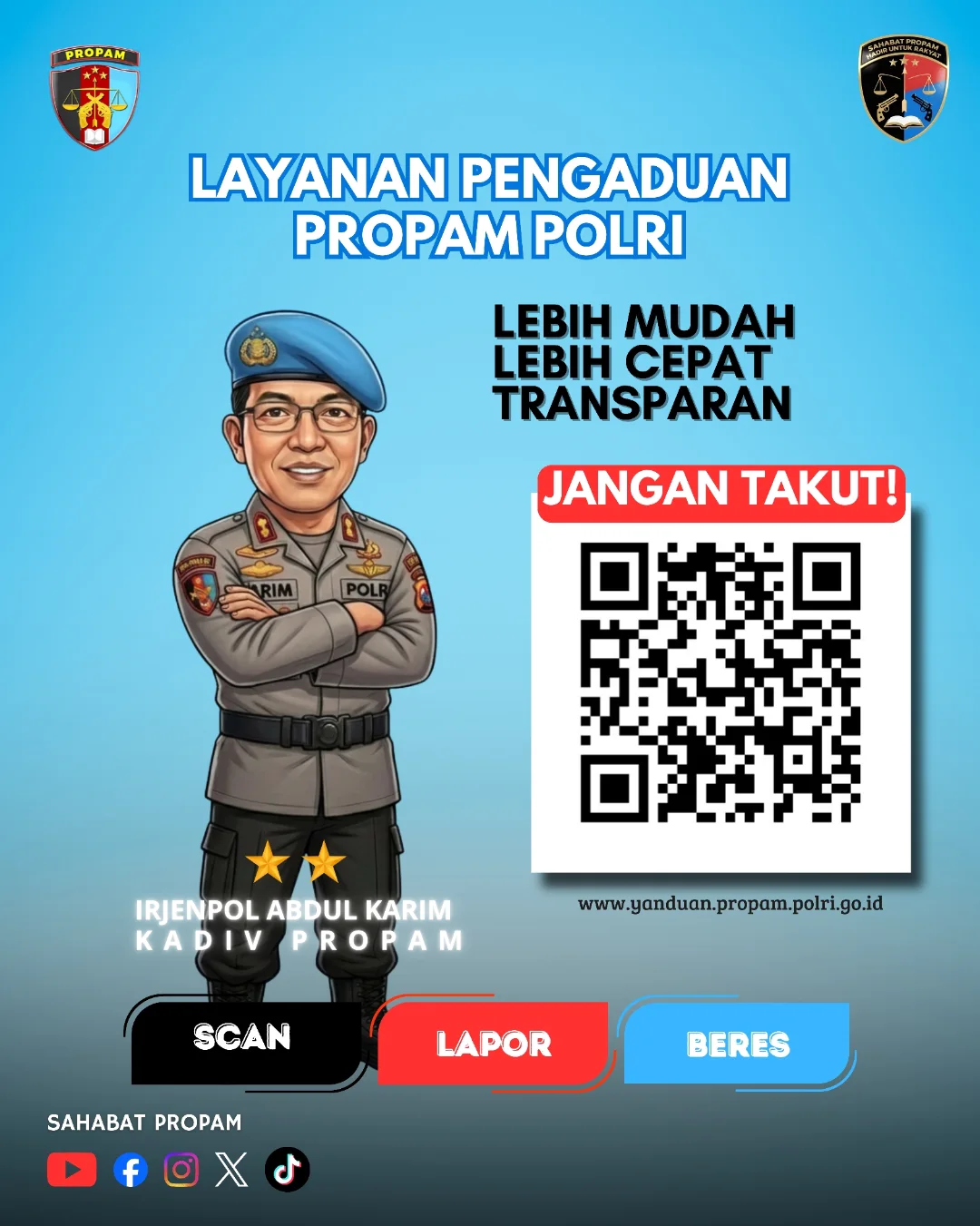 Dengan mengusung tagline “Scan – Lapor – Beres!”, Propam Polri menegaskan komitmennya untuk menciptakan ruang pengaduan yang aman, transparan, dan melindungi identitas pelapor, sekaligus memperkuat pengawasan demi Polri yang lebih bersih dan profesional.