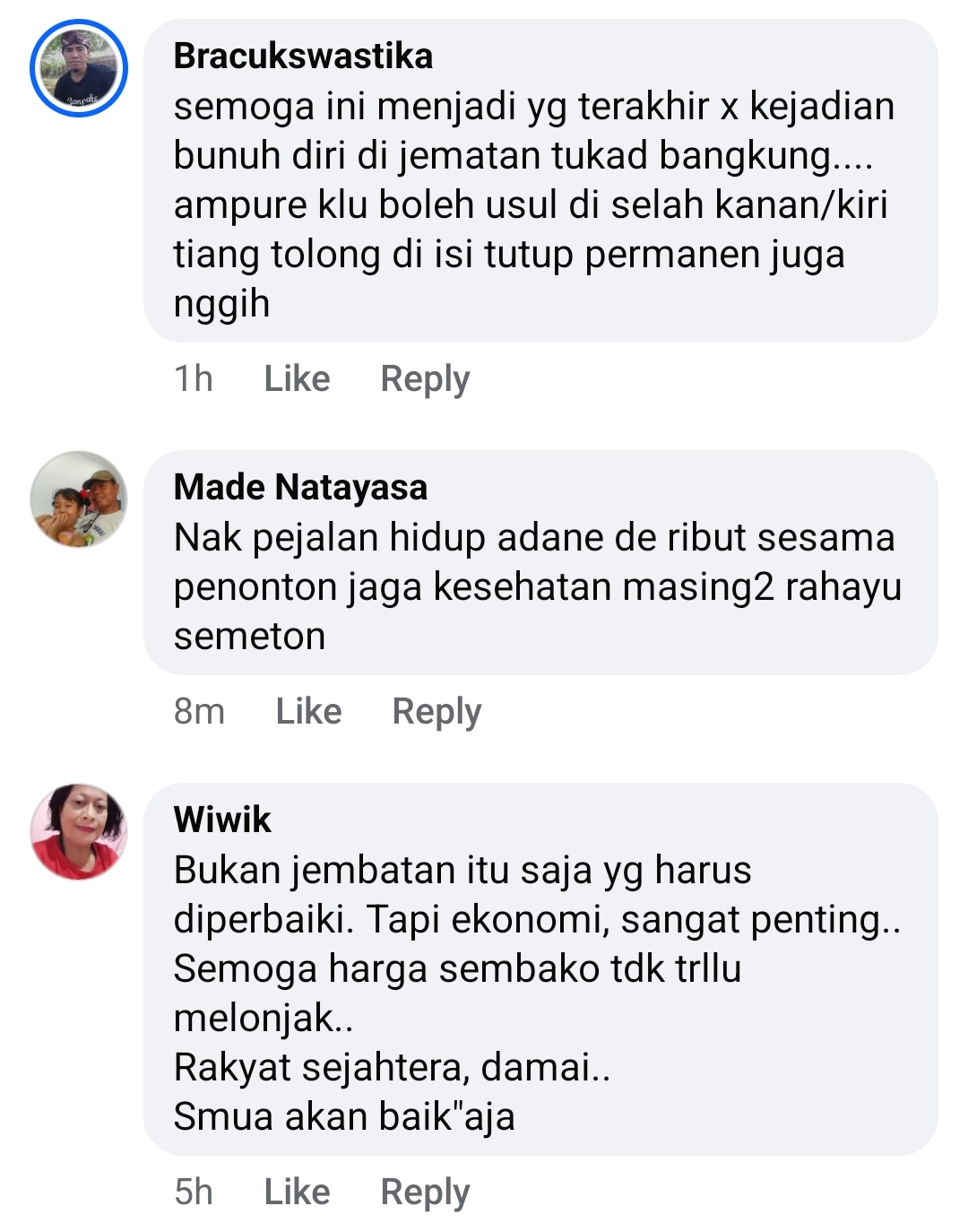 Sejumlah warganet pun menyuarakan pendapatnya. Akun Bracukswastika menulis, “Semoga ini menjadi yang terakhir kali ada kejadian bunuh diri di Jembatan Tukad Bangkung. Ampure, kalau boleh usul, di sela kanan-kiri tiang railing tolong ditutup permanen juga nggih.”