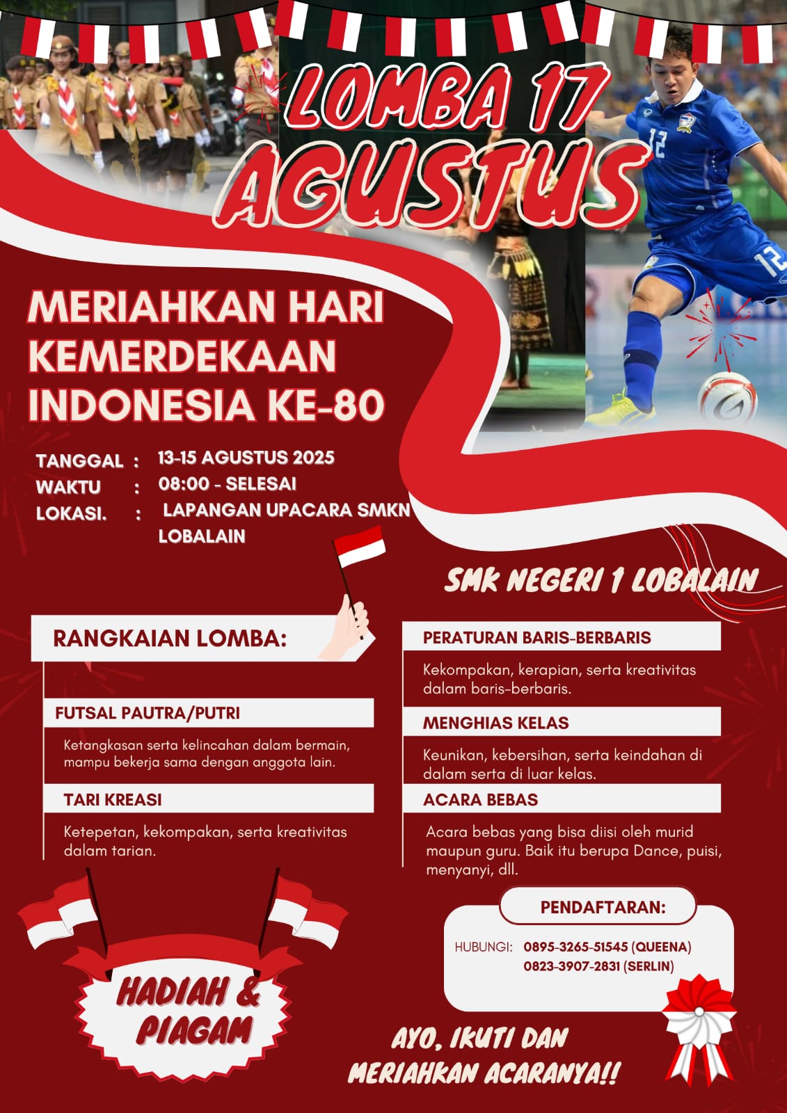 Lobalain – Suasana semarak terasa di SMK Negeri 1 Lobalain saat peringatan Hari Ulang Tahun ke-80 Republik Indonesia, yang digelar pada 13–15 Agustus 2025. Berbagai lomba kreatif diselenggarakan untuk menumbuhkan semangat nasionalisme sekaligus mengasah bakat dan kreativitas siswa-siswi.