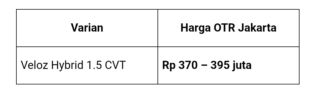 Harga On The Road (OTR) Veloz Hybrid dipatok mulai Rp 370 jutaan di wilayah Jabodetabek, dengan kemungkinan variasi harga di luar kawasan tersebut. Sementara pajak tahunan diperkirakan antara Rp 4,7–5,7 juta, dan biaya lima tahunan termasuk ganti pelat berada pada kisaran Rp 7–9 juta.