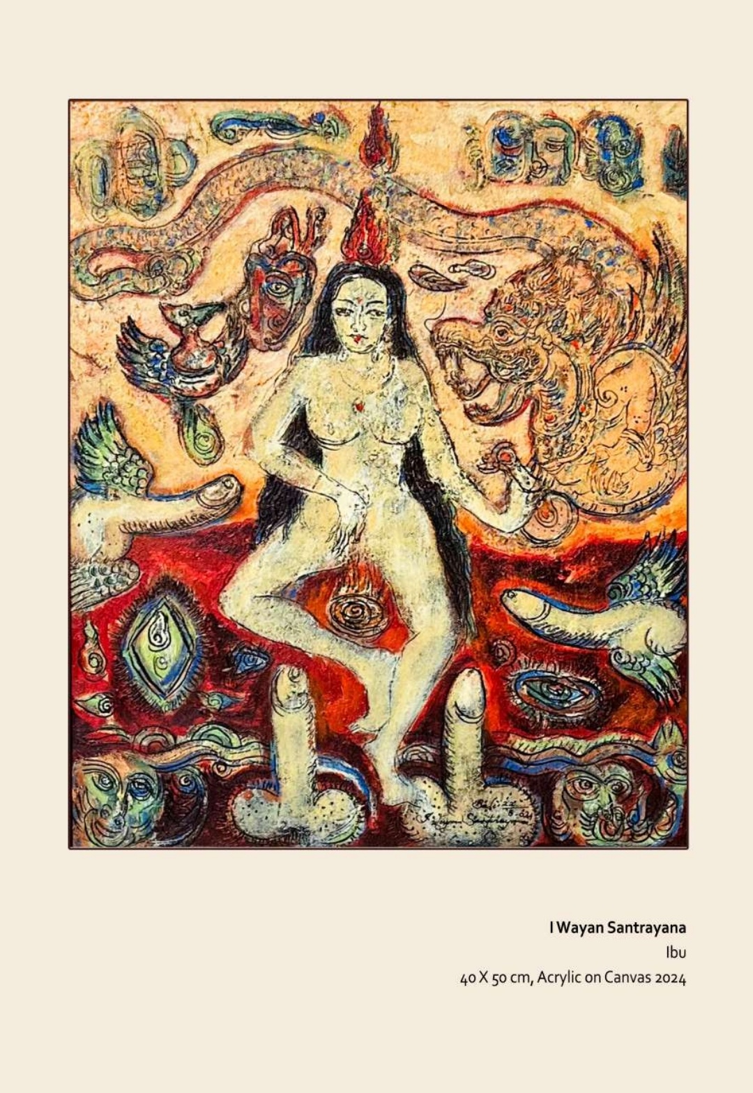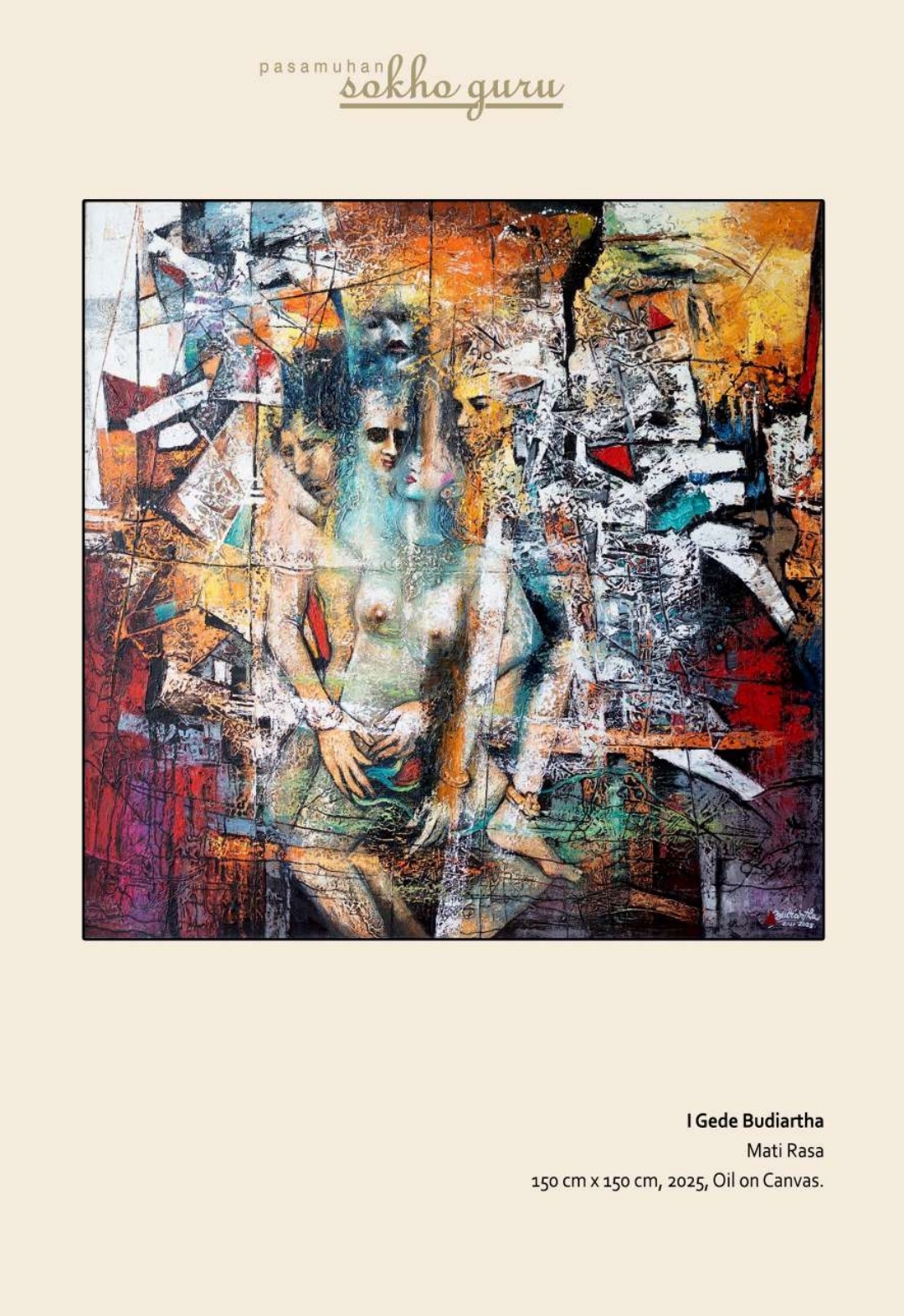 Kemudian Gede Budiartha menghadirkan karya dengan kecenderungan abstraksi yang kuat. Melalui permainan warna, garis, dan gestur, ia mengeksplorasi tema-tema tentang rasa dan dinamika batin manusia yang menjadi inti dari pengalaman kemanusiaan.