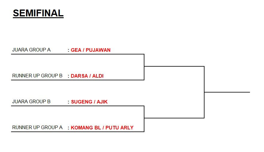 Sementara itu, partai semifinal lainnya mempertemukan Ajik/Sugeng melawan Komang BL/Arly pada pukul 19.00 WITA. (Tim)