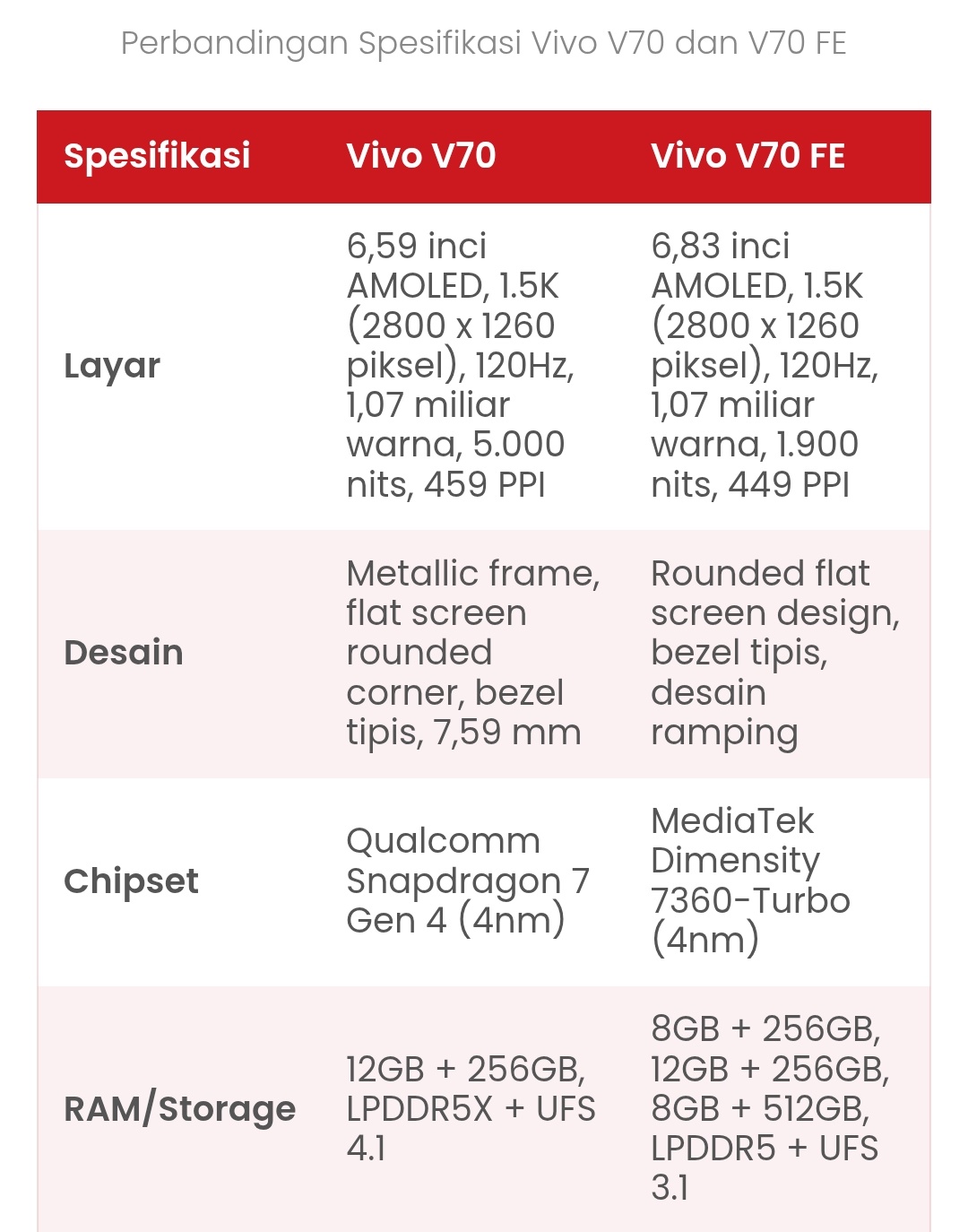 Sementara itu, Vivo V70 FE hadir sebagai Fashion Edition yang menawarkan spesifikasi menarik dengan harga lebih terjangkau. Perangkat ini membawa layar AMOLED 6,83 inci beresolusi 1.5K dengan refresh rate 120Hz dan tingkat kecerahan hingga 1.900 nits.